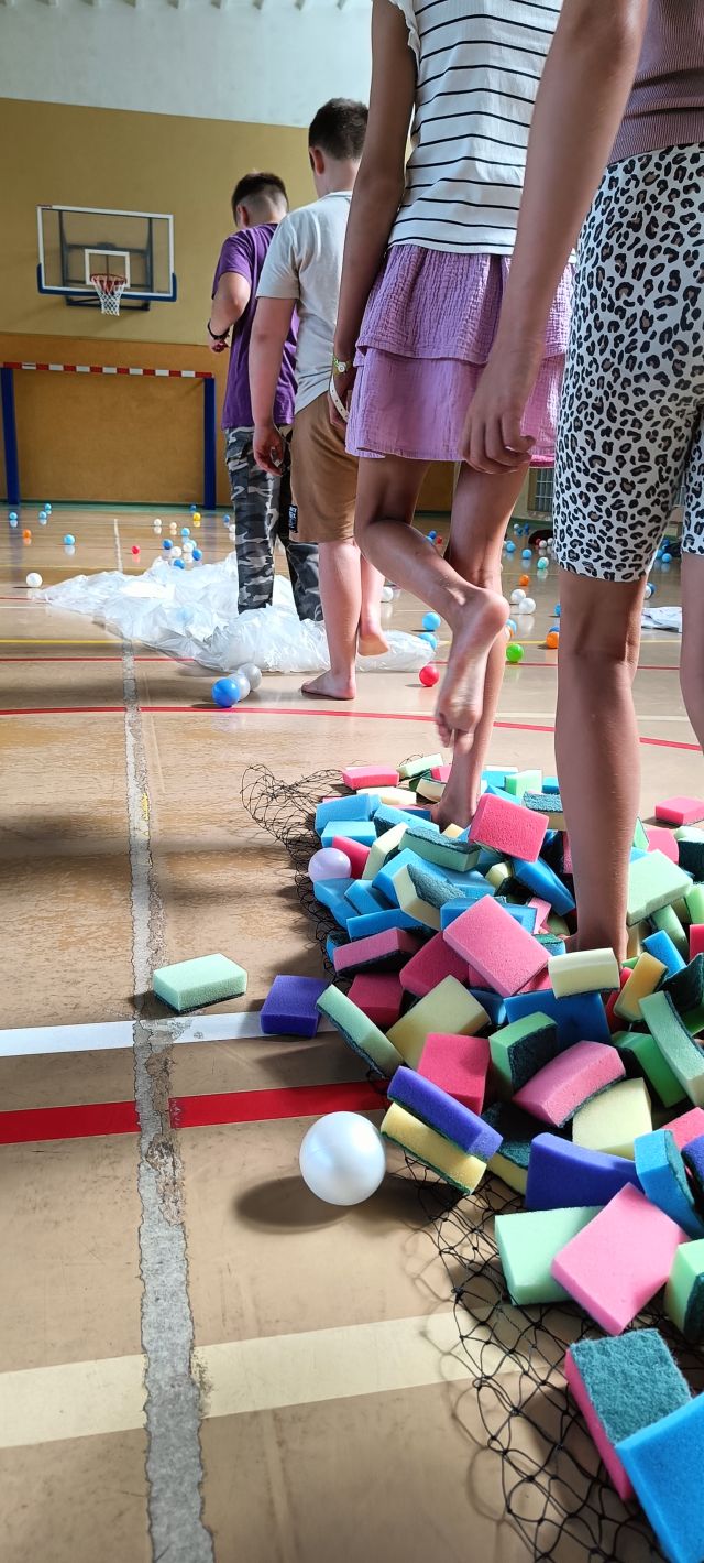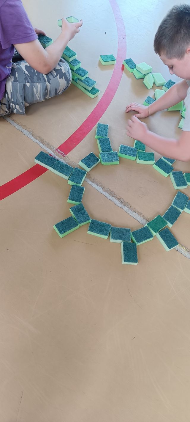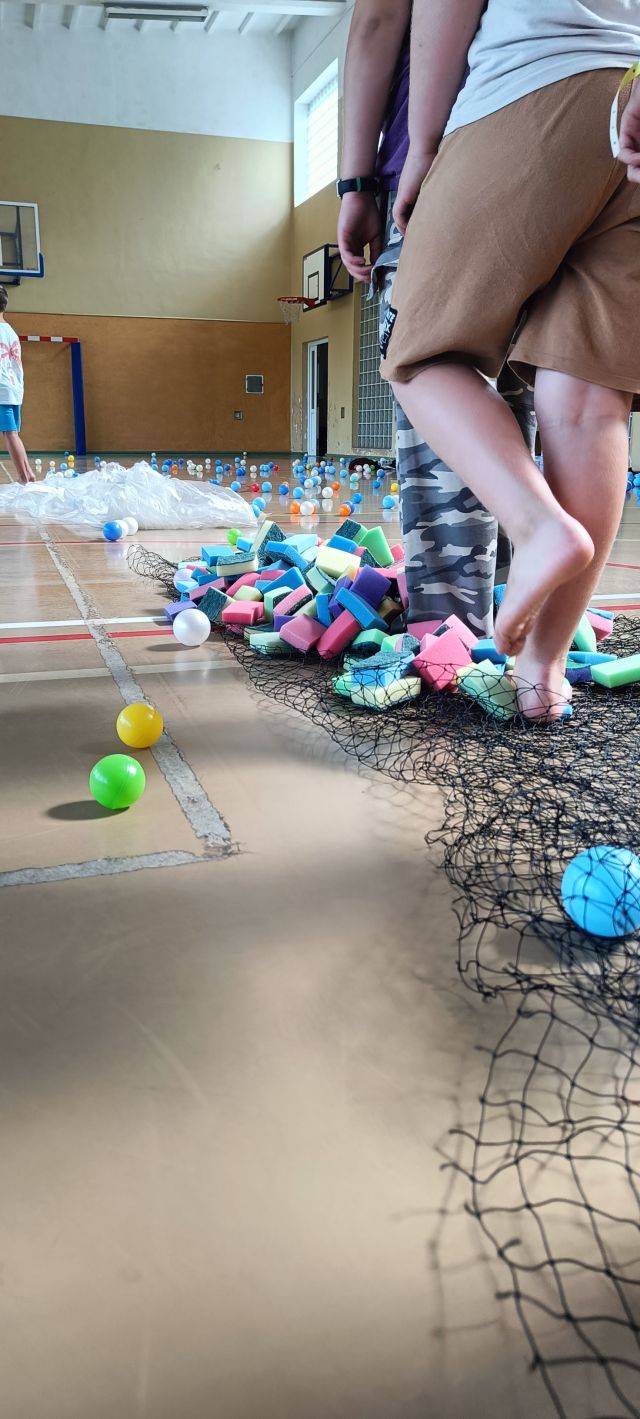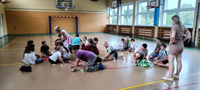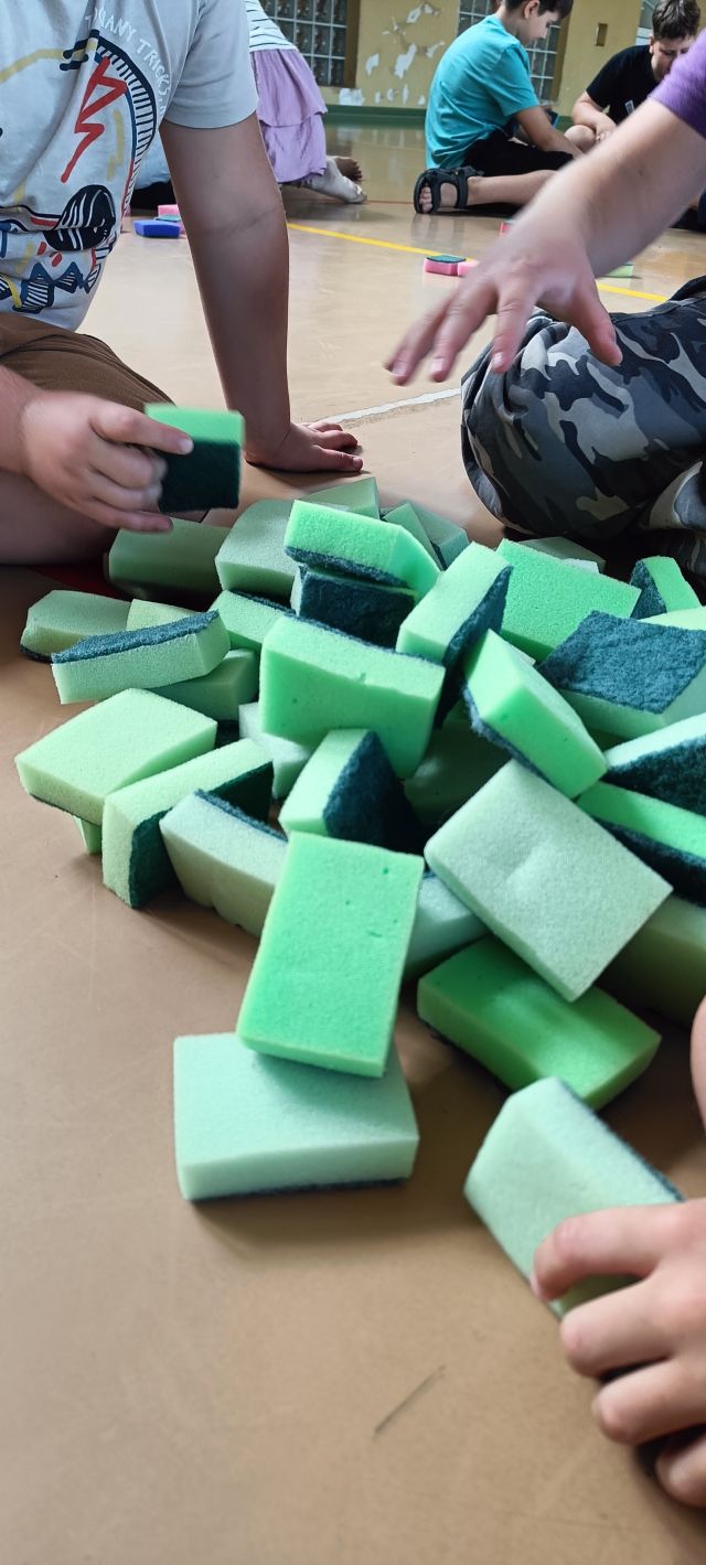 Zabawy odbywały się w grupach i zawierały elementy aktywności sensorycznych. Wykorzystaliśmy do nich proste materiały: gąbki do mycia naczyń, siatkę, folię malarską oraz wodę. Uczniowie z dużym zaangażowaniem podejmowali proponowane zadania, które wywoływały wiele uśmiechu i pozytywnych emocji. Ćwiczenia pozwoliły na rozwijanie współpracy, kreatywności oraz integrację całej społeczności klasowej.