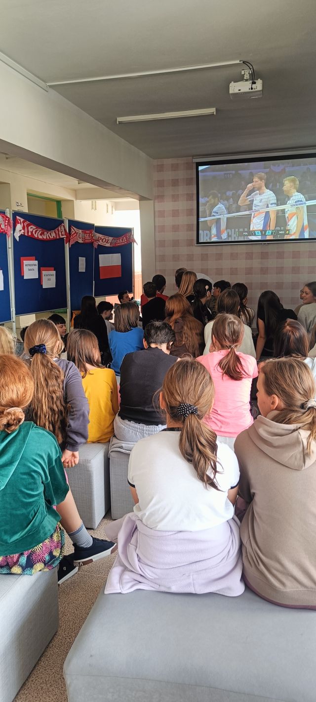 Podczas Mistrzostw Świata w siatkówce mężczyzn nasz szkolny kącik zabaw zamienił się w prawdziwą strefę kibica. Uczniowie, nauczyciele i pracownicy szkoły wspólnie oglądali mecz Polska – Holandia, zagrzewając biało-czerwonych do walki.