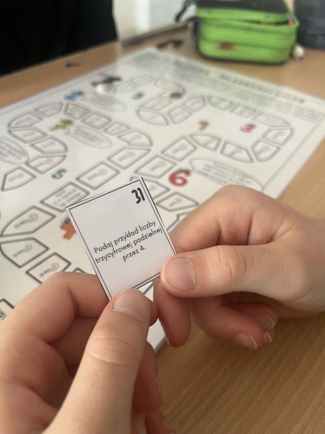 Uczniowie klasy 5b rozpoczęli zabawę od gry planszowej poświęconej własnościom liczb, a następnie wzięli udział w grze „Ala dobble”, gdzie liczyła się nie tylko spostrzegawczość, ale też znajomość cech podzielności liczb. Każda runda przynosiła wiele emocji i radości, a przy okazji — solidną porcję matematycznych powtórek.
