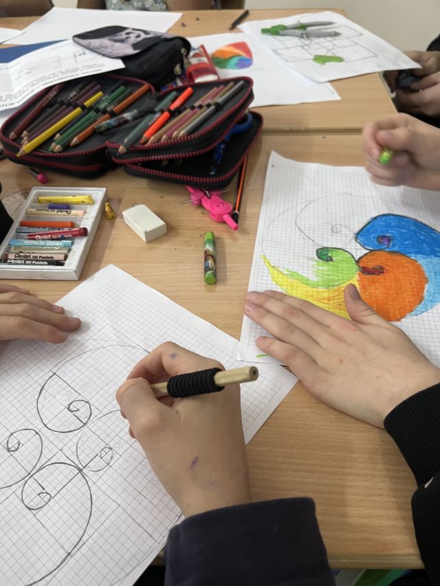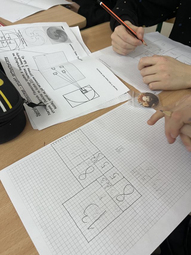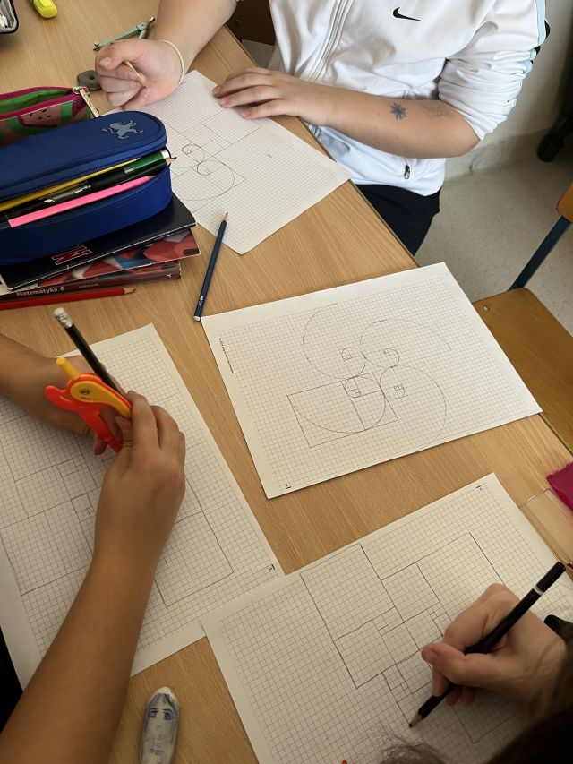 Największym wyzwaniem dnia było rysowanie spirali Fibonacciego. Każdy uczeń został małym geometrycznym twórcą, z linijką w jednej dłoni i cyrklem w drugiej (czasem nie do końca współpracującym 😉). Rysowanie delikatnych, równych łuków wymagało cierpliwości, skupienia i odrobiny wiary, że „tym razem wyjdzie idealnie!”. I wyszło — a każdy kolejny fragment spirali wyglądał coraz piękniej.