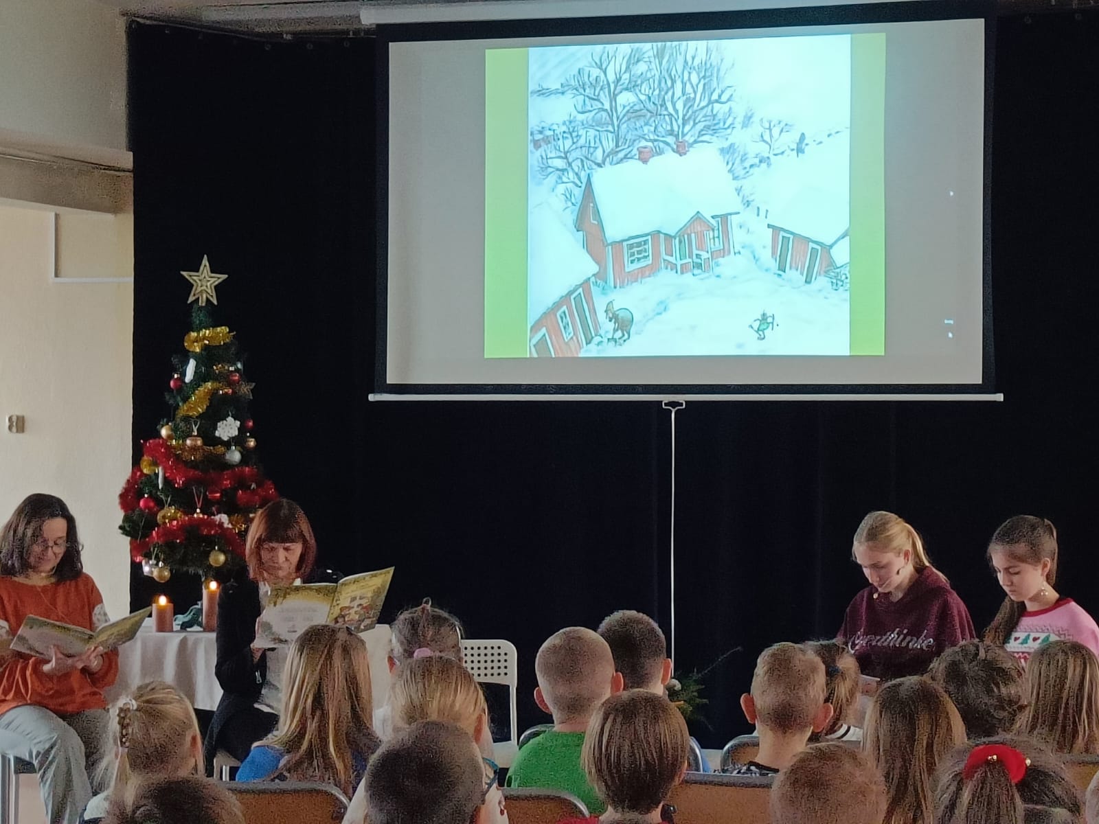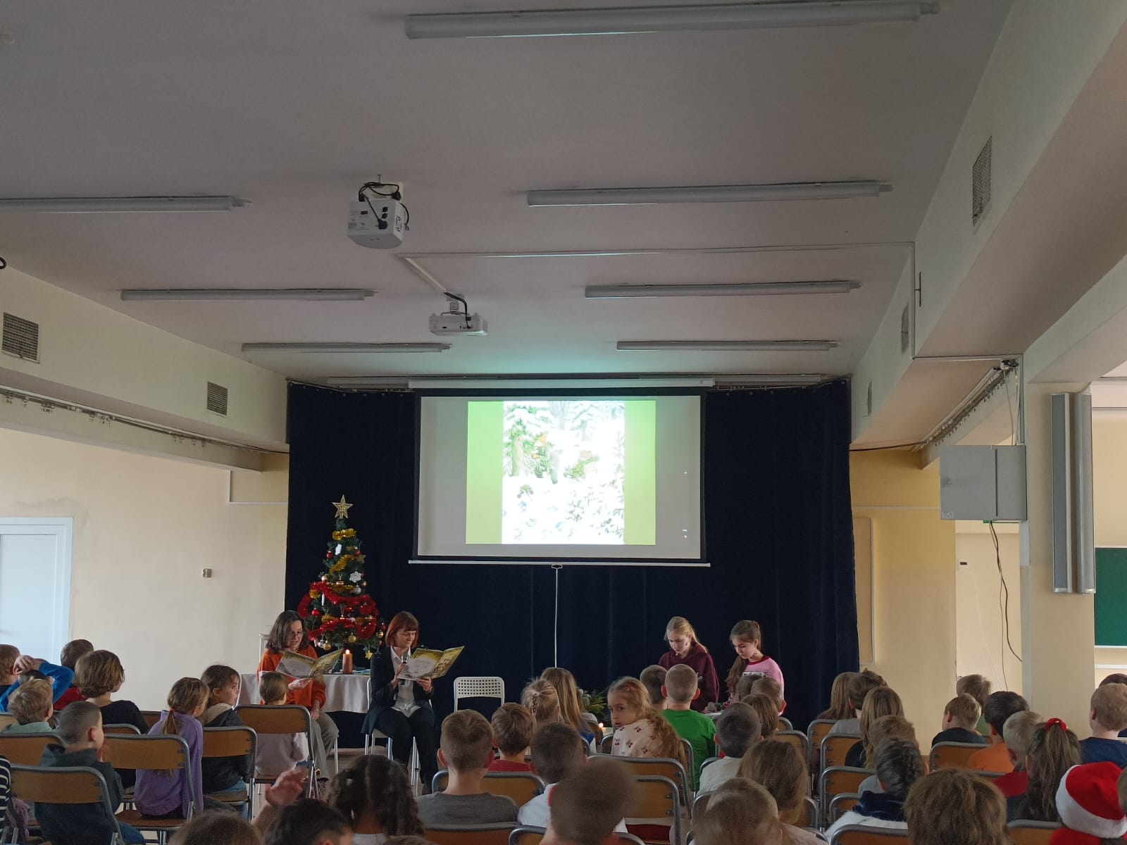 Książeczkę z podziałem na role przeczytały wszystkim: pani dyrektor Katarzyna Cichosz, pani Justyna Jarek oraz dwie uczennice klasy 7b: Julia Tomczyk i Zlata Mandro. Quiz świąteczny przygotowała pani Weronika Kokocińska, a spotkanie poprowadziła pani Marlena Borowska. Wszyscy uczniowie dostali też drobną pamiątkę przygotowaną przez panią Justynę.