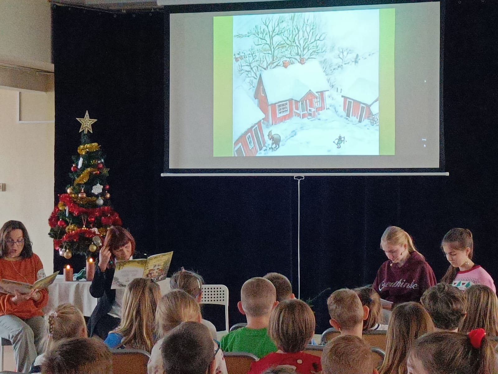 W grudniu odbyło się w naszej szkole czytelnicze spotkanie dla klas I-III. Już po raz drugi zaprosiłyśmy najmłodszych uczniów szkoły na świąteczne spotkanie z książką. W tym roku pani Justyna wybrała dla nas uroczą książeczkę o wiele mówiącym tytule Goście na Boże Narodzenie. Było więc świątecznie i z mądrym przesłaniem dotyczącym tego, co w świętach jest najważniejsze.