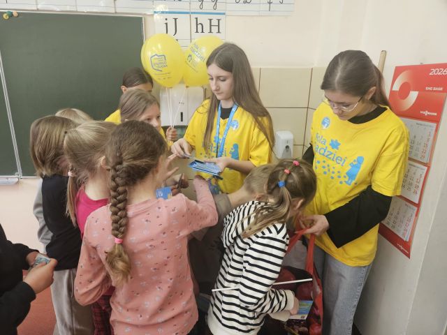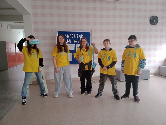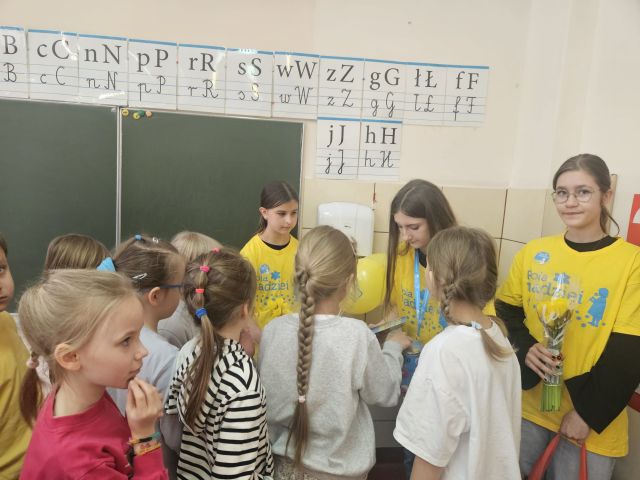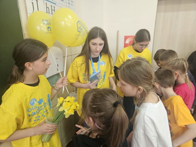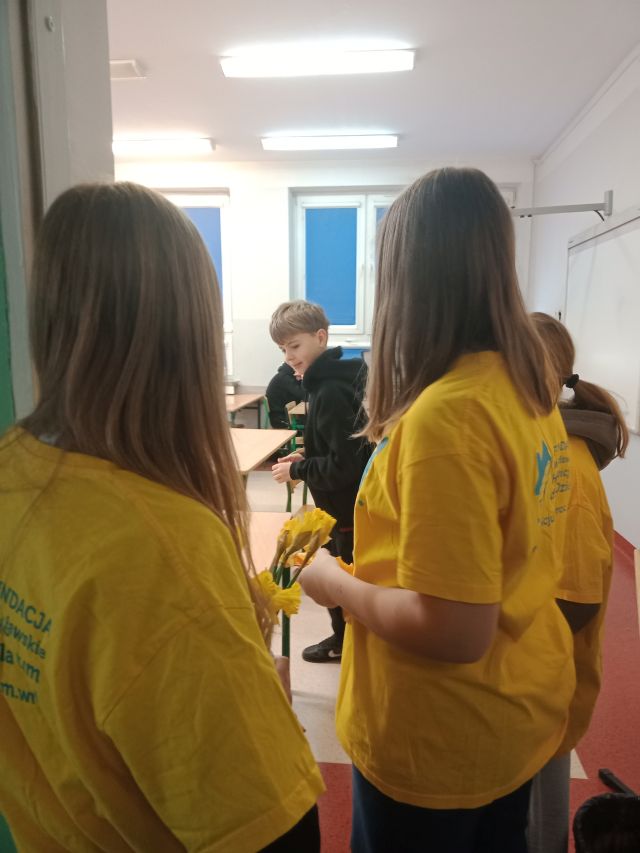 Wolontariusze w żółtych koszulkach z logo fundacji rozdawali żonkile, balony i naklejki.