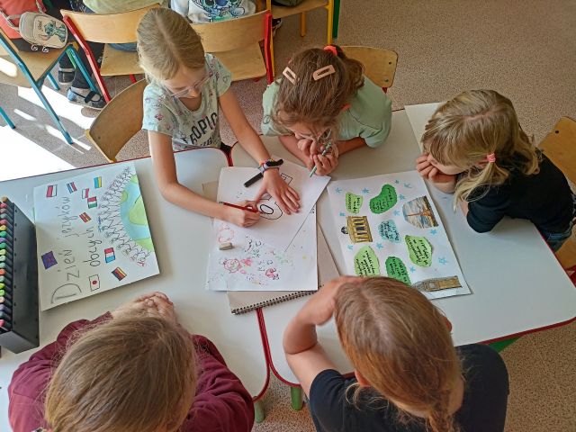 Dzieci na zajęciach świetlicowych wykonały plakaty i przygotowały wystawę na holu , która ma na celu zachęcić do nauki języków obcych na każdym etapie życia.