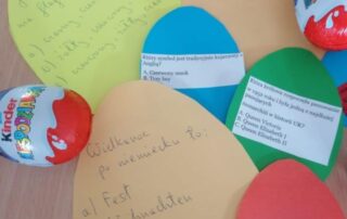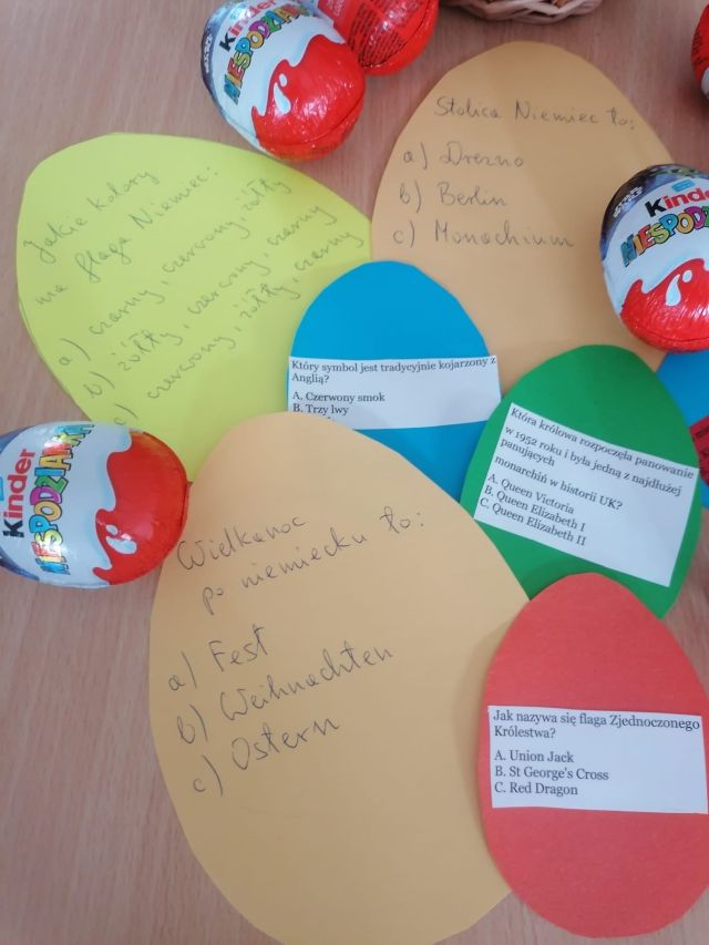 Podczas zabawy uczniowie mieli okazję wziąć udział w poszukiwaniu ukrytych na terenie szkoły jajek. W każdym z nich znajdowały się pytania dotyczące kultury i tradycji krajów anglojęzycznych oraz Niemiec. Uczestnicy wykazali się dużą wiedzą i zaangażowaniem, a poprawne odpowiedzi były nagradzane.